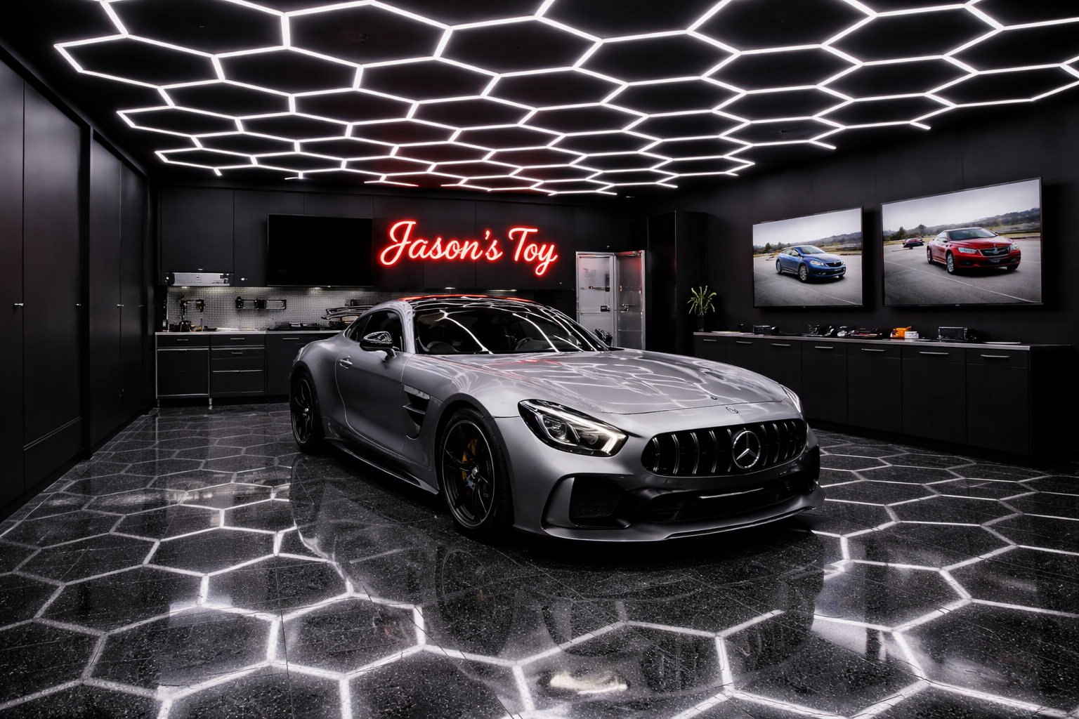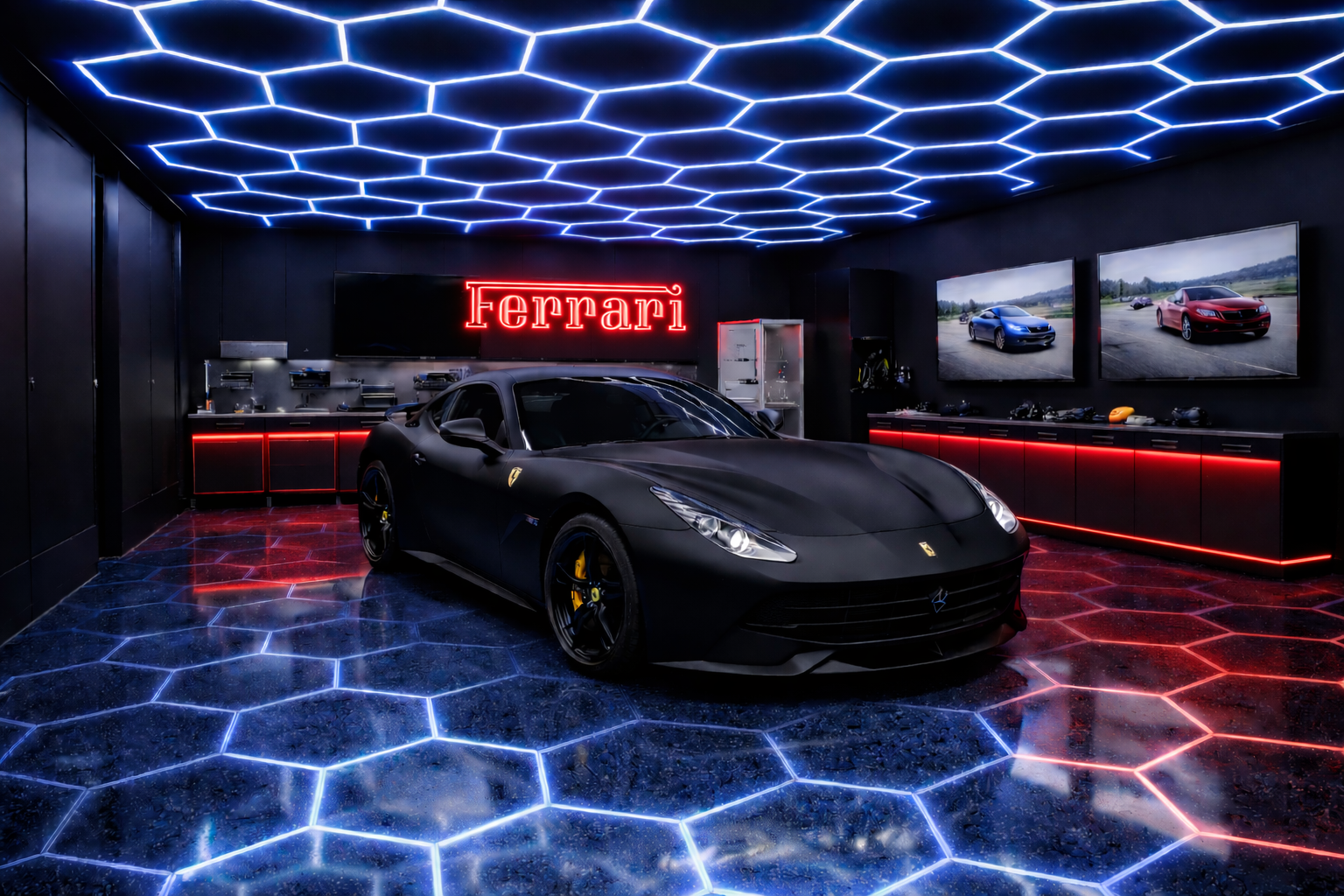 Our designs feature modern LED systems including hex grid lighting, perimeter glow accents, under-cabinet illumination, and color-changing RGB integrations. Every layout is tailored to your space, highlighting key focal points like vehicles, walls, flooring, and display areas while maintaining clean symmetry and balance.